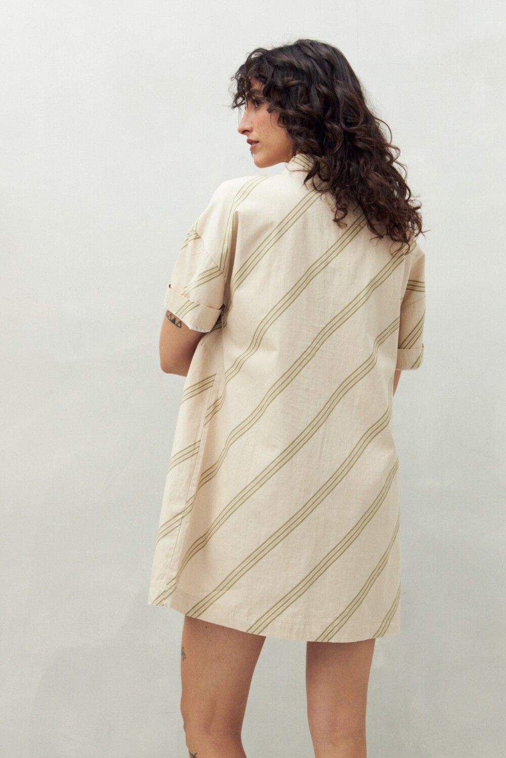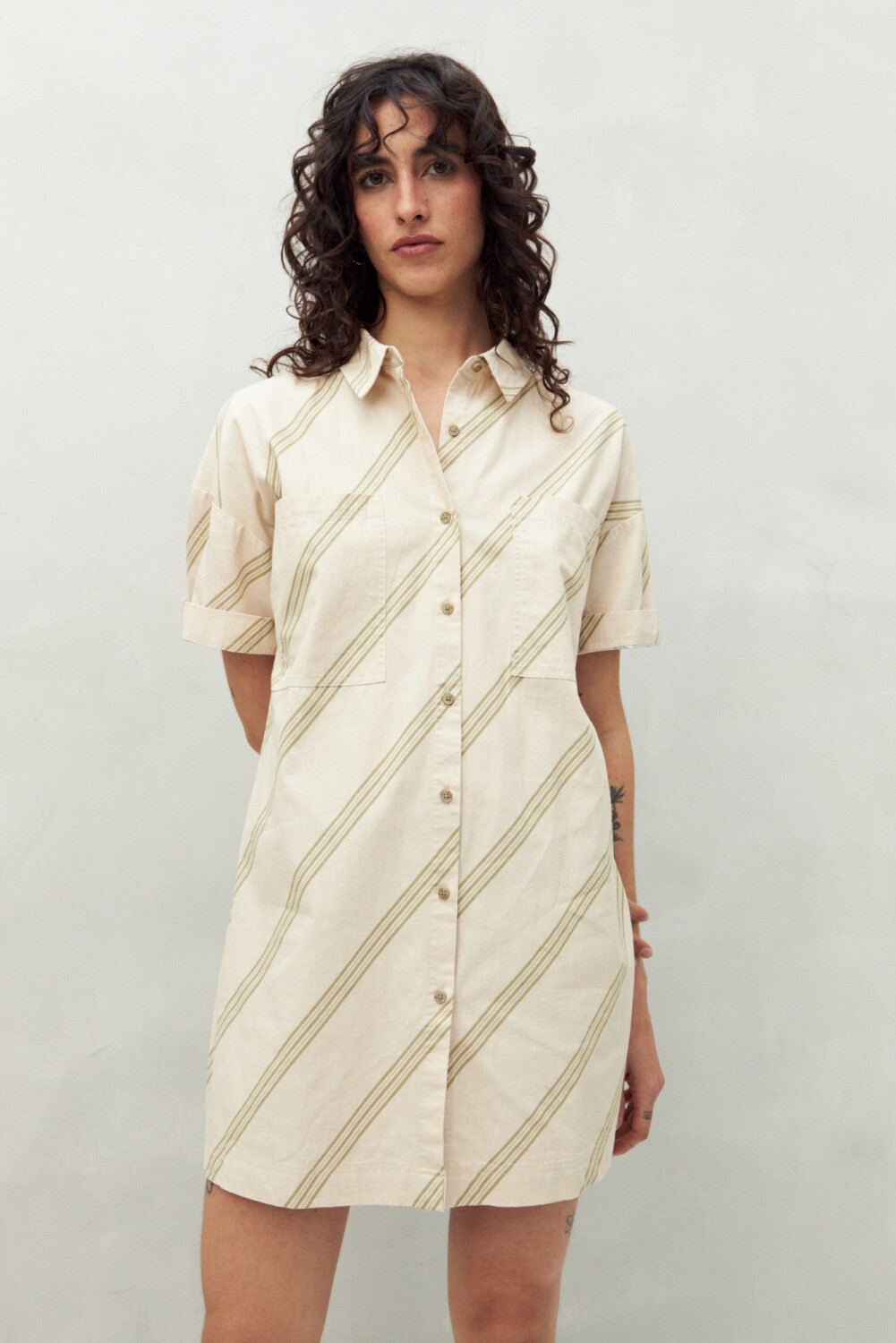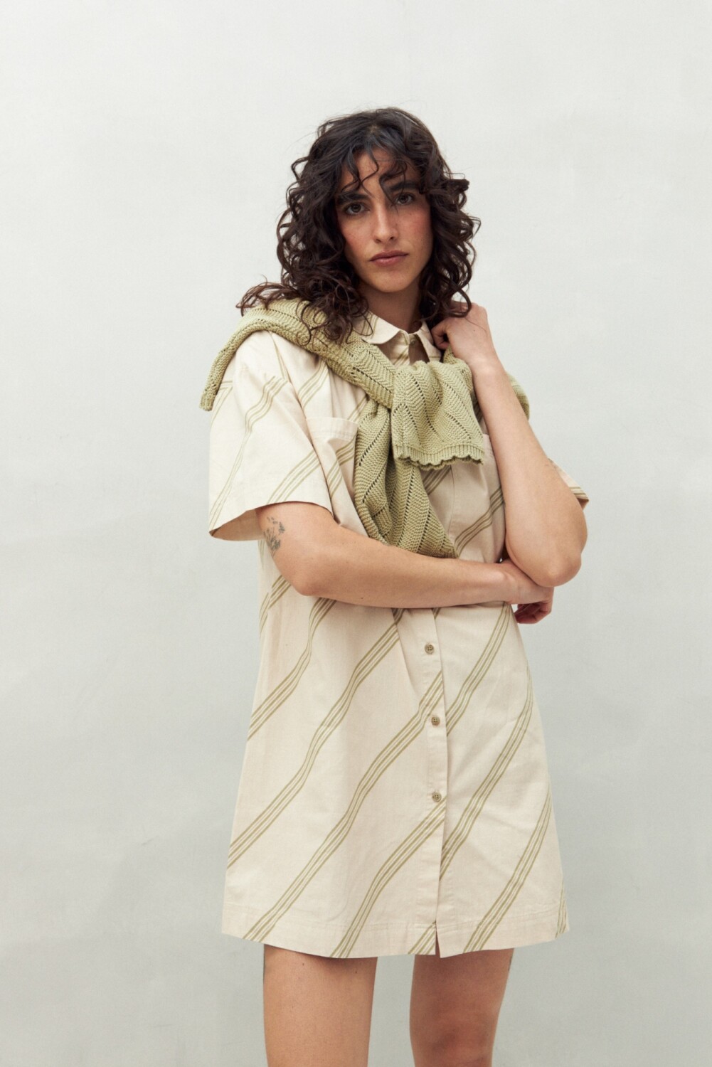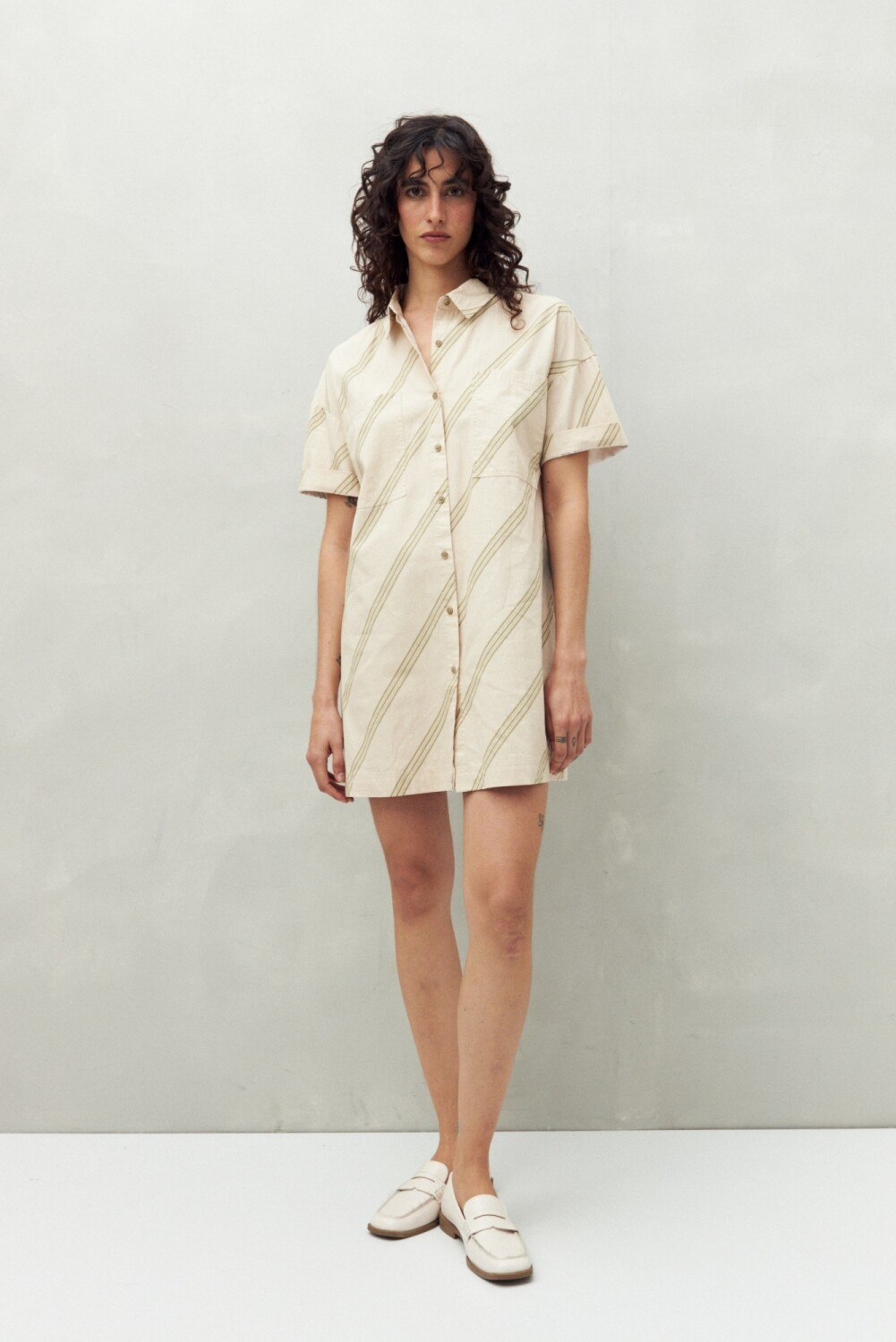 Este vestido camisero es la mezcla perfecta entre frescura y versatilidad. Confeccionado en algodón, destaca por su silueta relajada y femenina, pensada para acompañarte tanto en el día a día como en ocasiones más especiales. El diseño abotonado al frente y los bolsillos aportan practicidad, mientras que las estampas —rayas diagonales o motivos orgánicos— le suman un aire actual y trendy.