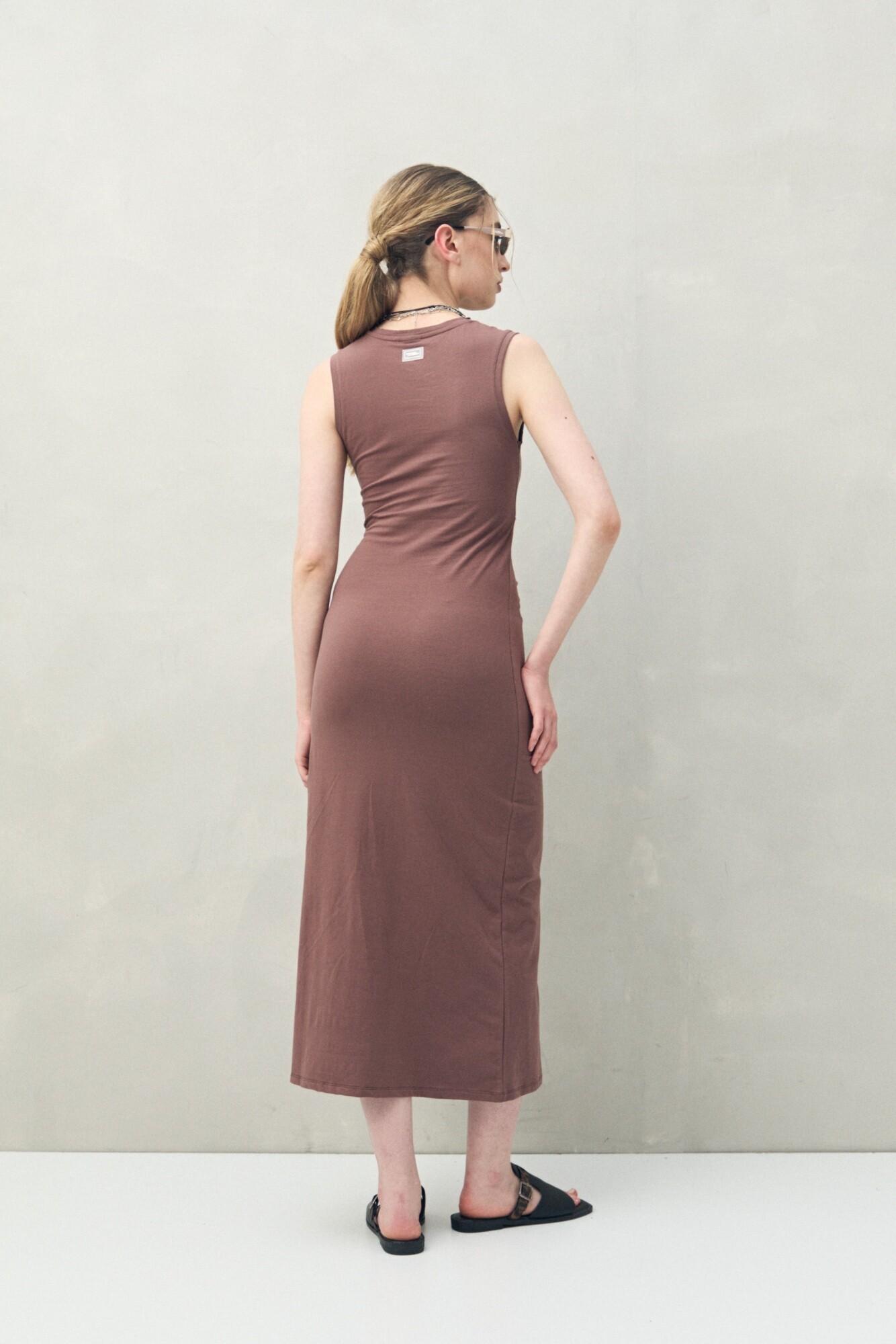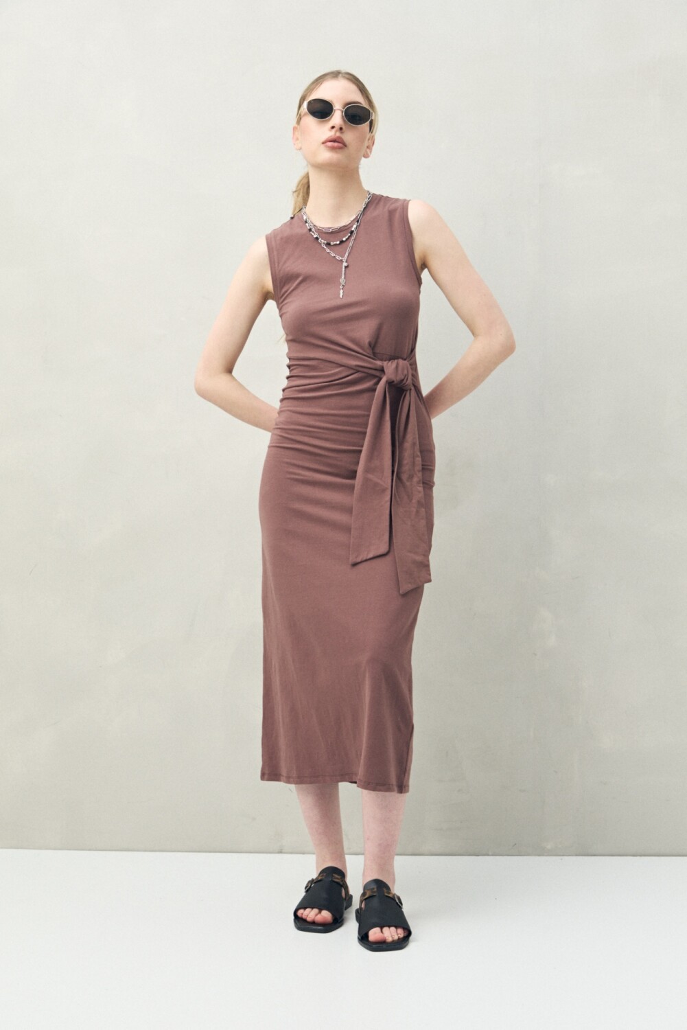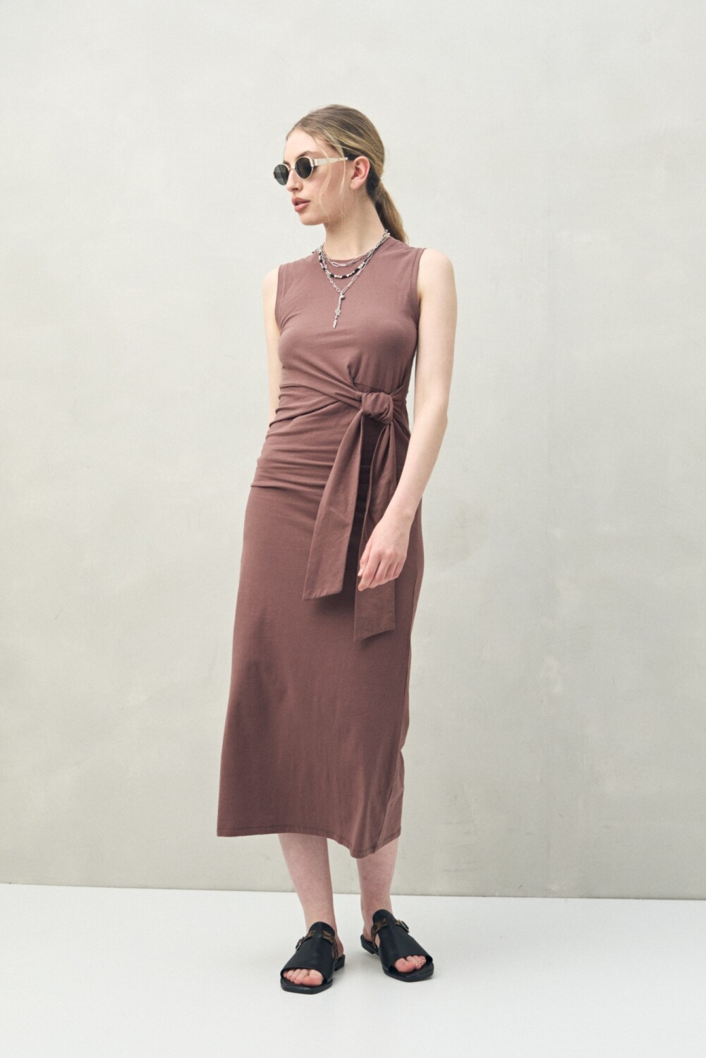 Vestido largo de punto sin mangas que combina simpleza y sofisticación en una silueta limpia y femenina. Su diseño entallado realza la figura, mientras el lazo lateral incorpora un detalle protagonista que permite ajustar y marcar la cintura, generando un efecto estilizador. Una prenda atemporal que se adapta a distintas ocasiones y estilos, resolviendo el outfit con actitud.