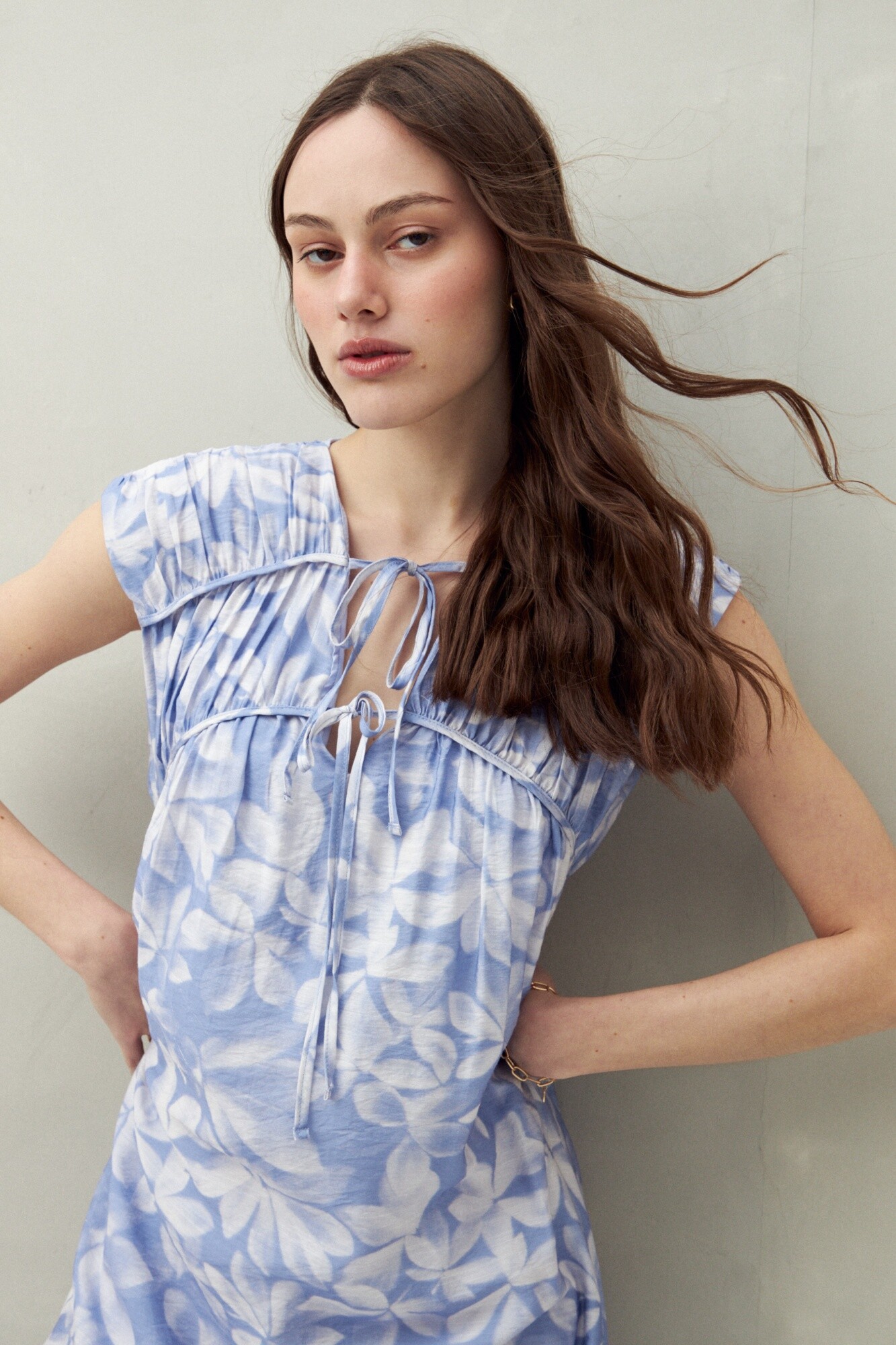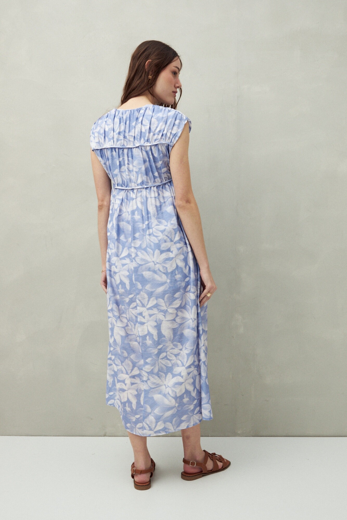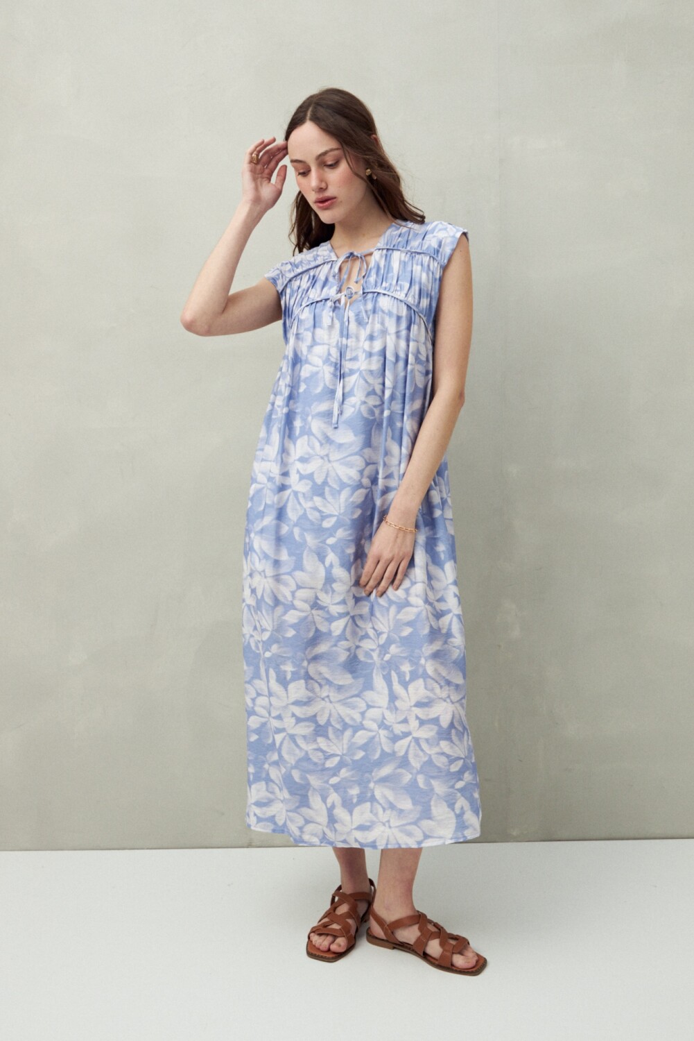 Vestido largo con escote ajustable y lazo, confeccionado en un tejido fluido y liviano que aporta una caída natural. El frunce en la parte superior genera movimiento y un aire romántico, mientras que su silueta amplia lo convierte en una opción fresca y cómoda para los días de verano.