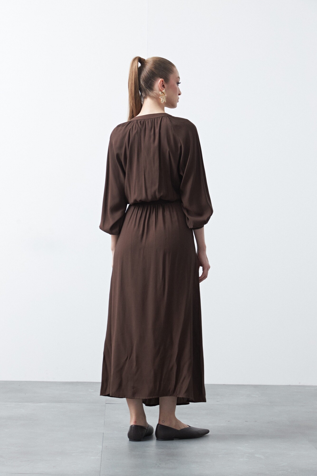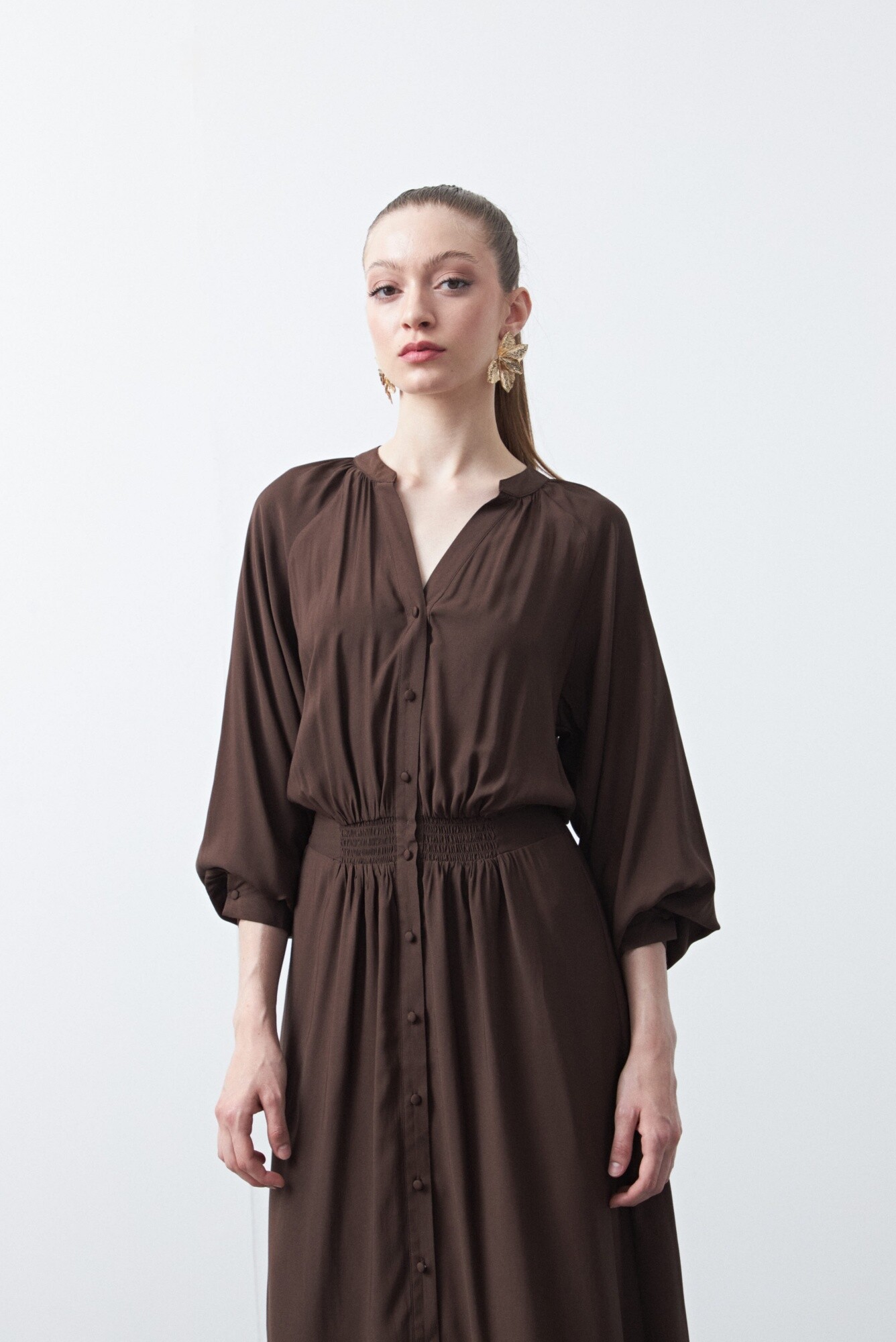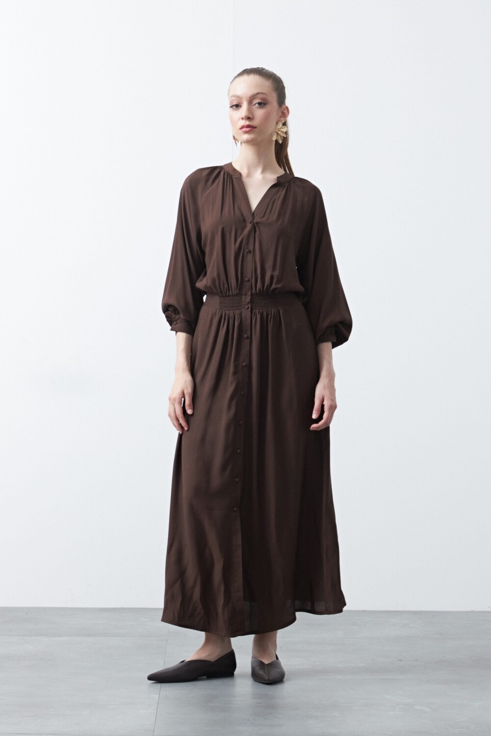 Vestido largo de silueta fluida con escote en V, una prenda versátil pensada para acompañar la jornada completa. El diseño con botones al frente aporta prolijidad y estructura, mientras que la cintura elastizada define la silueta sin resignar comodidad. Las mangas largas equilibran el conjunto, logrando un vestido ideal para looks de oficina que se adapta fácilmente a un after office o a una salida nocturna, según cómo se accesorice.