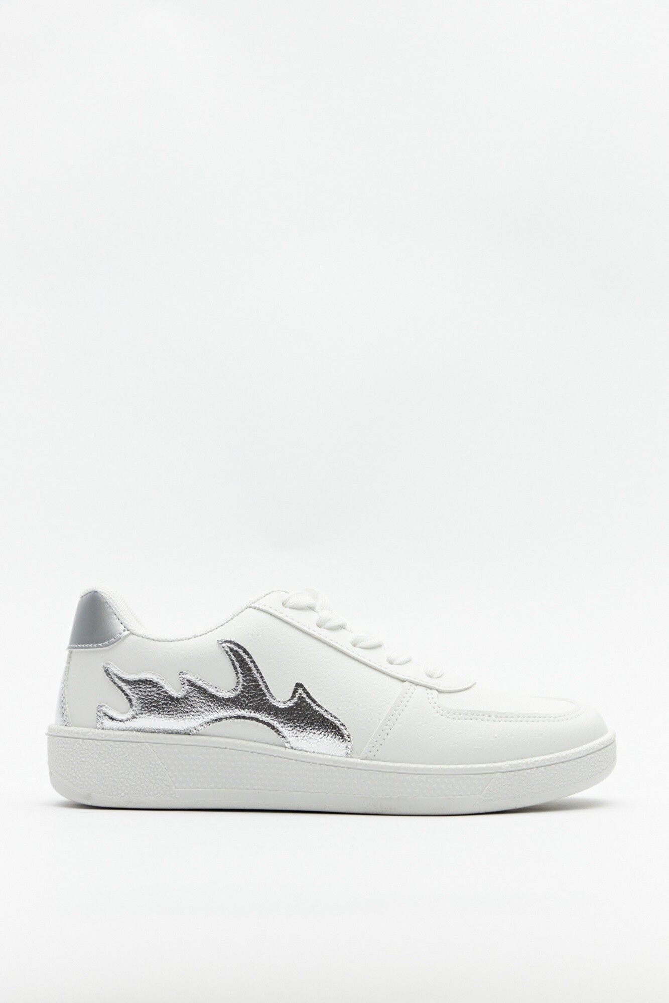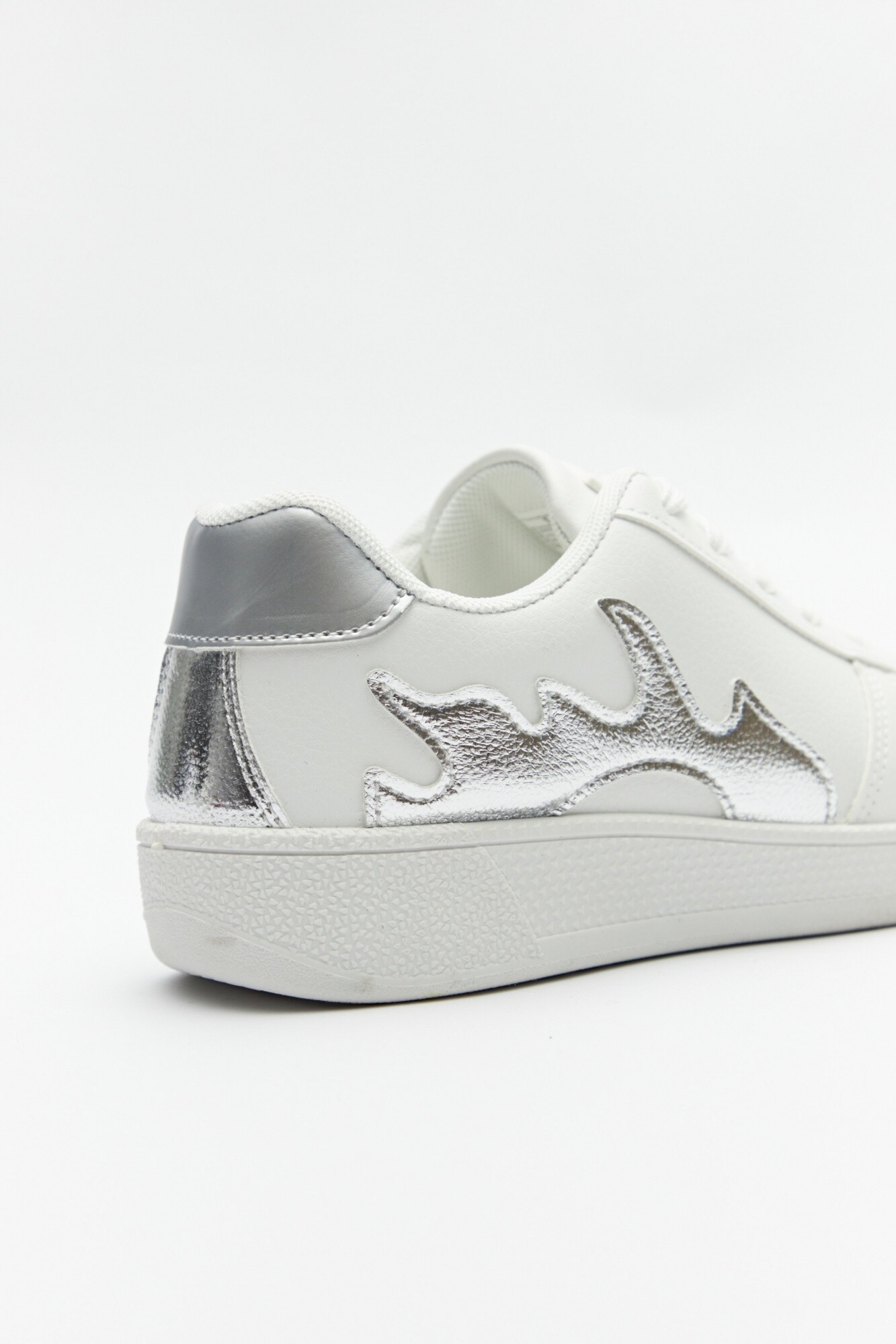 Zapatillas en símil cuero con recortes metálicos y brillantes. Cuentan con cordones a tono y suela de 3,5cm de alto.