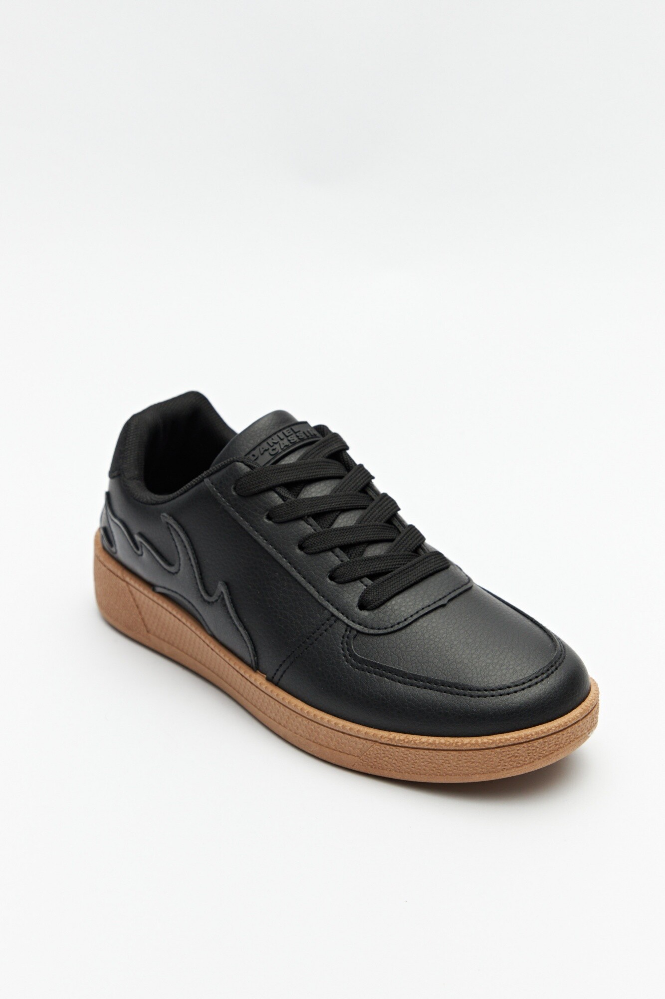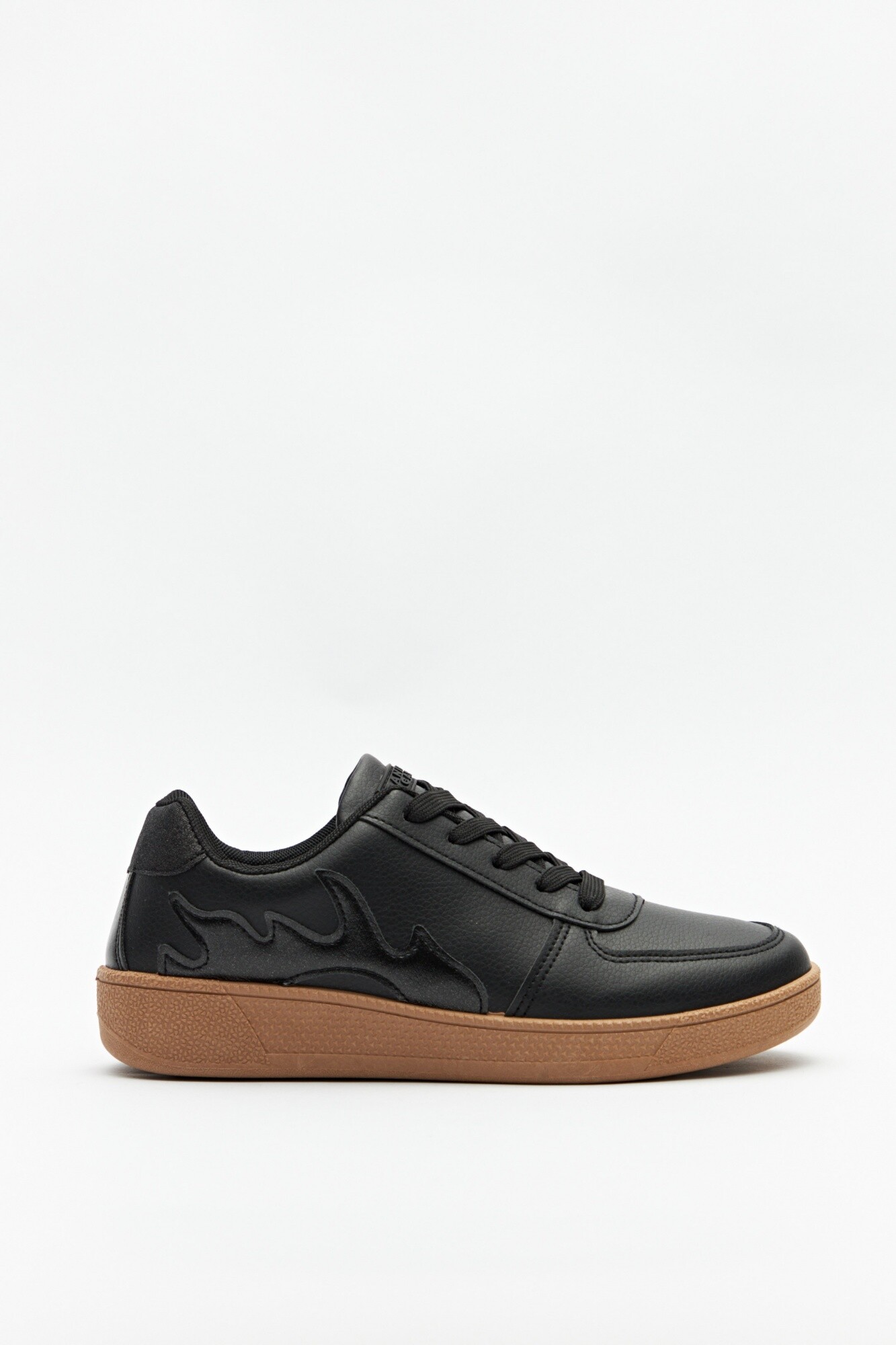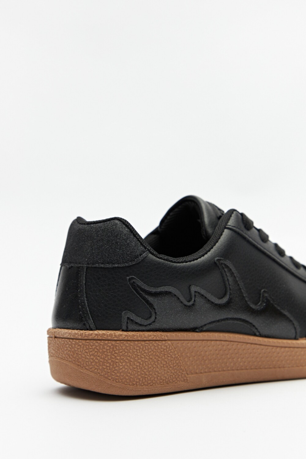 Zapatillas en símil cuero con recortes metálicos y brillantes. Cuentan con cordones a tono y suela de 3,5cm de alto.