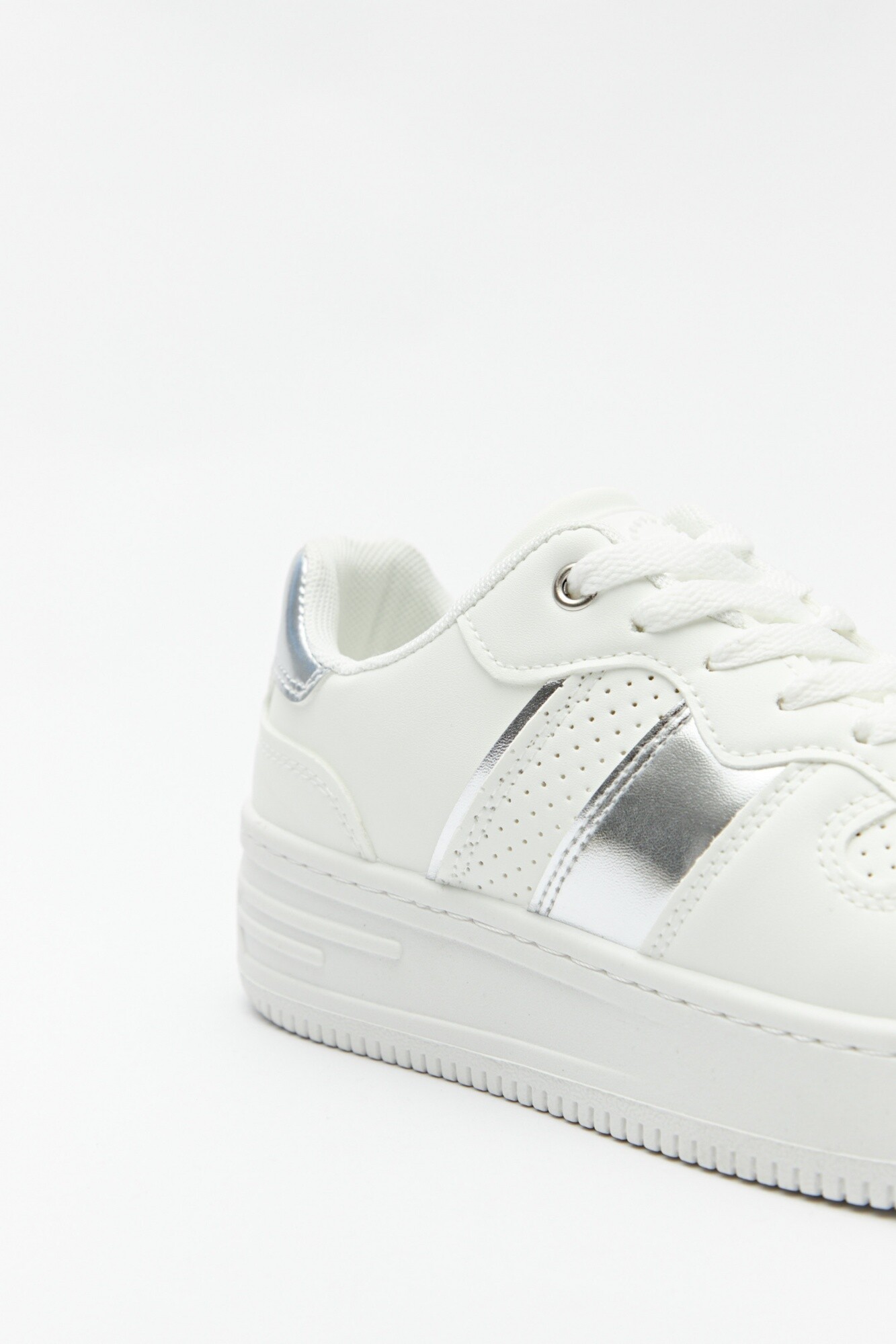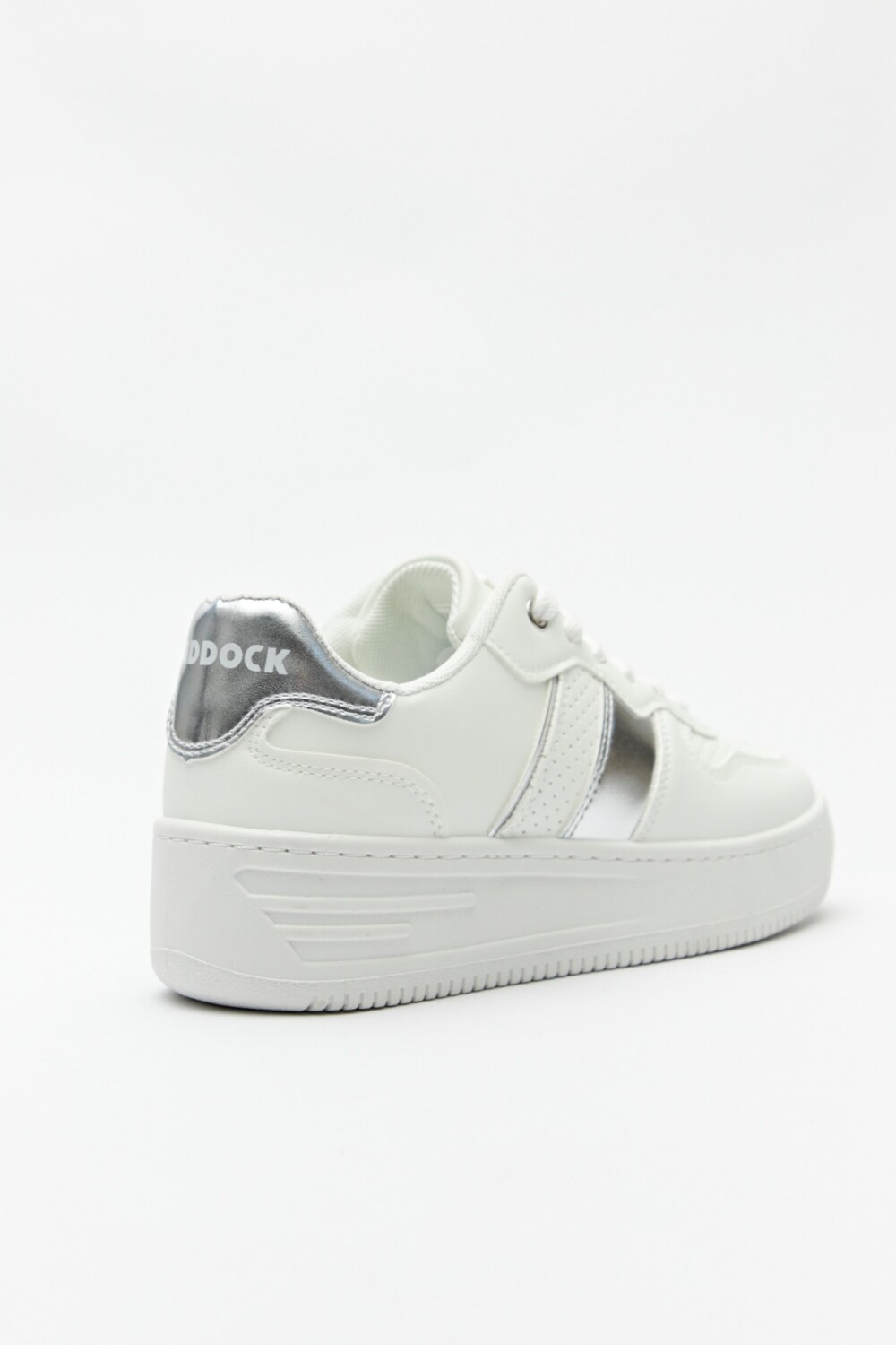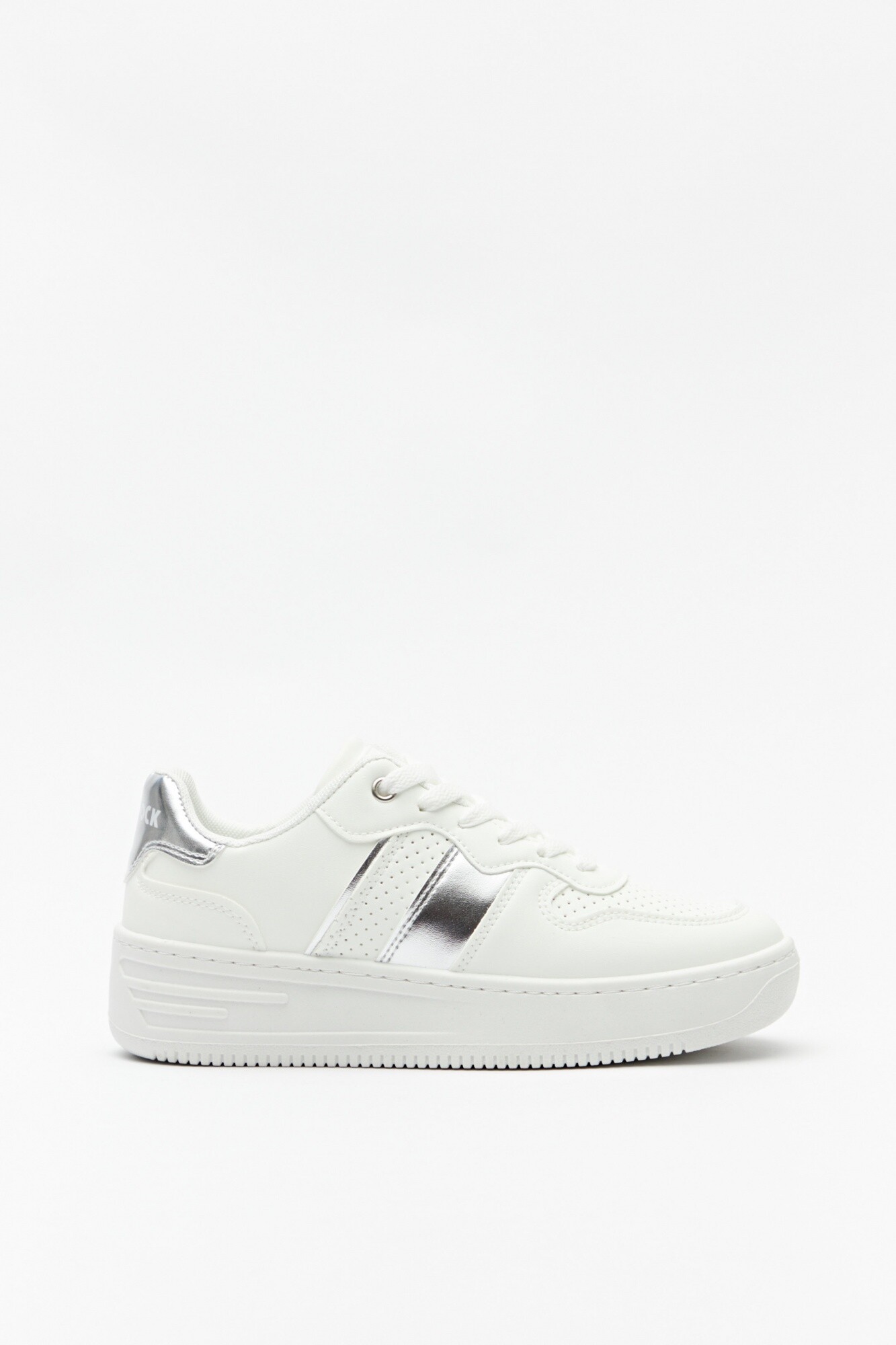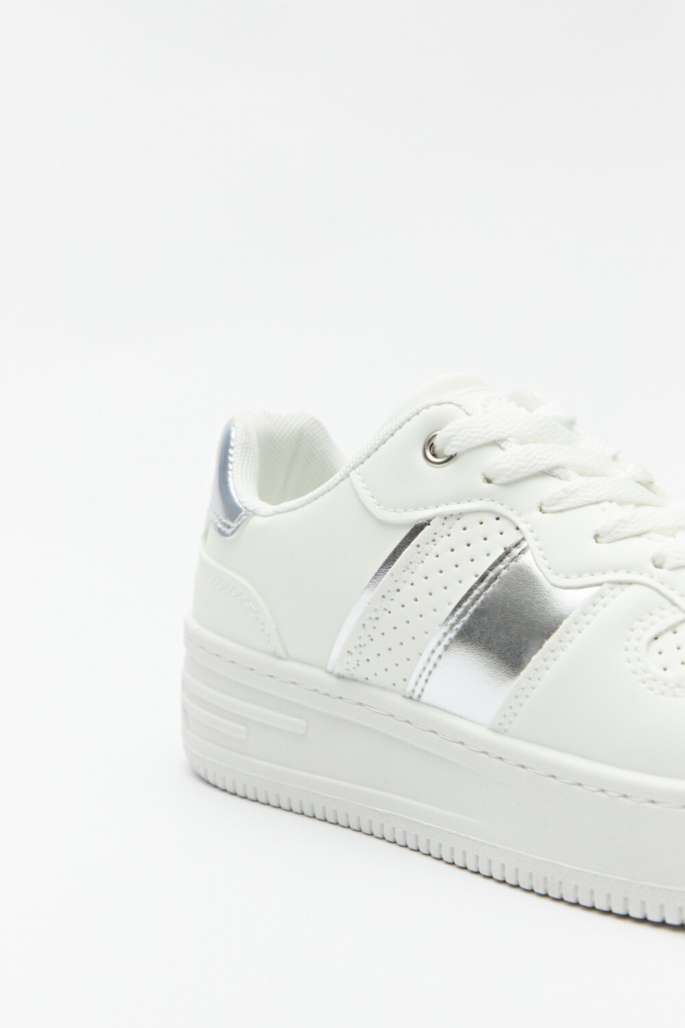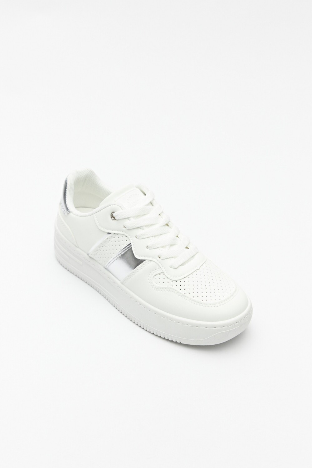 Zapatillas en símil cuero con recortes tanto en gamuza como metalizados y calados entre otros. Tiene una plataforma de 4,5cm de alto.