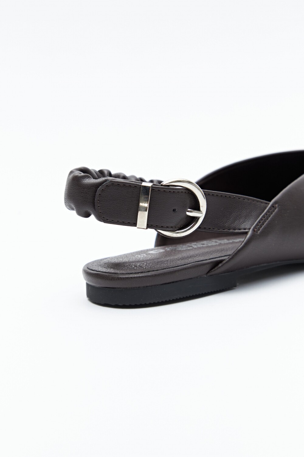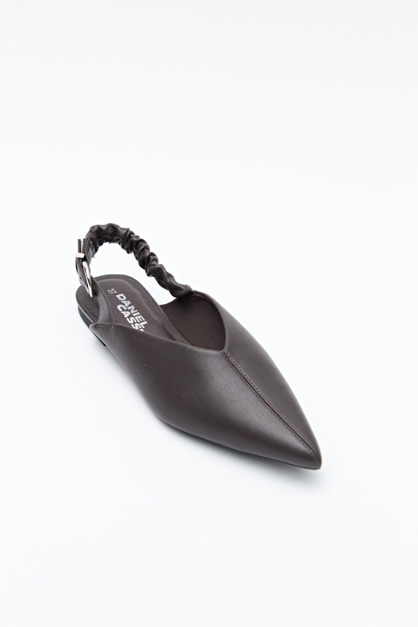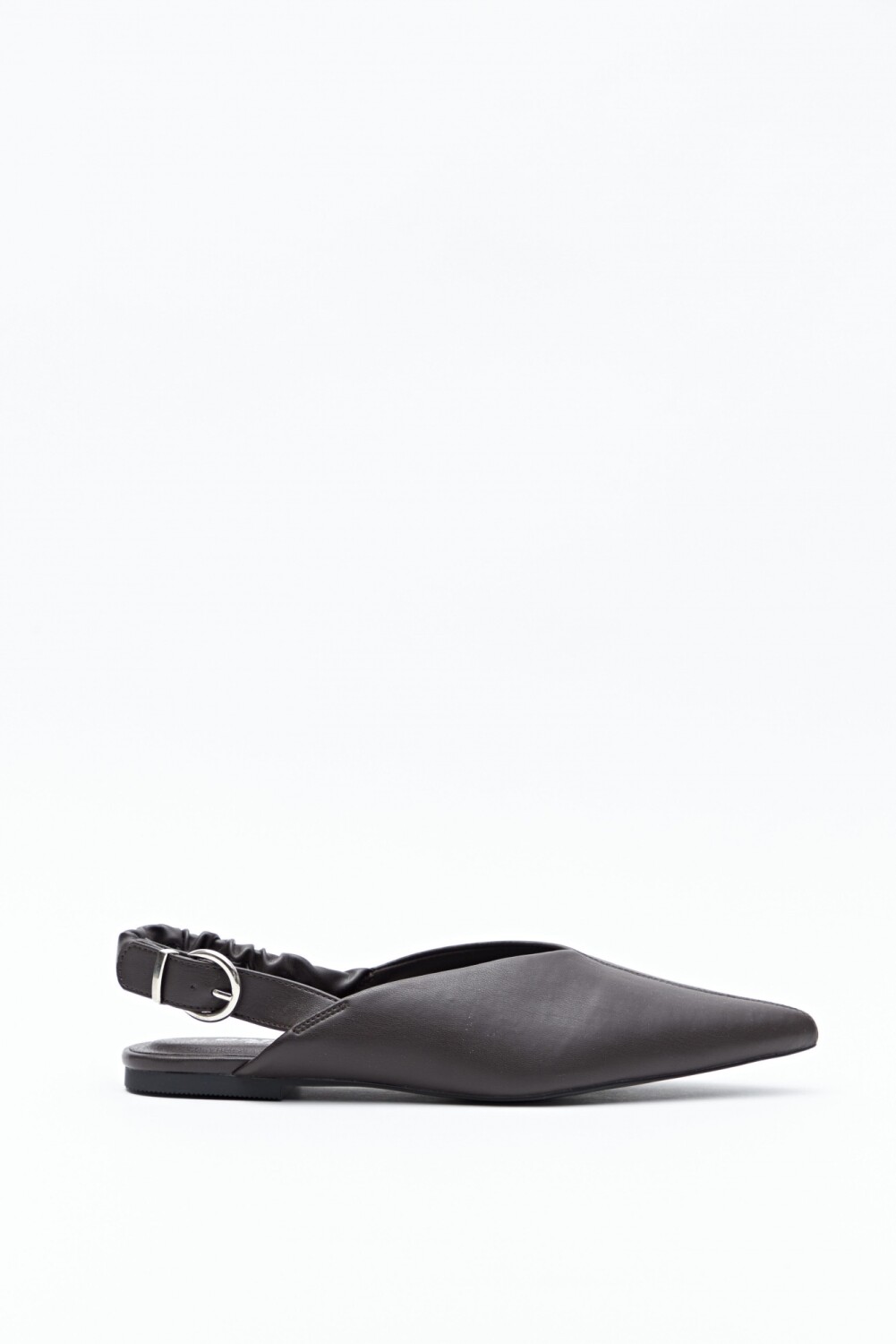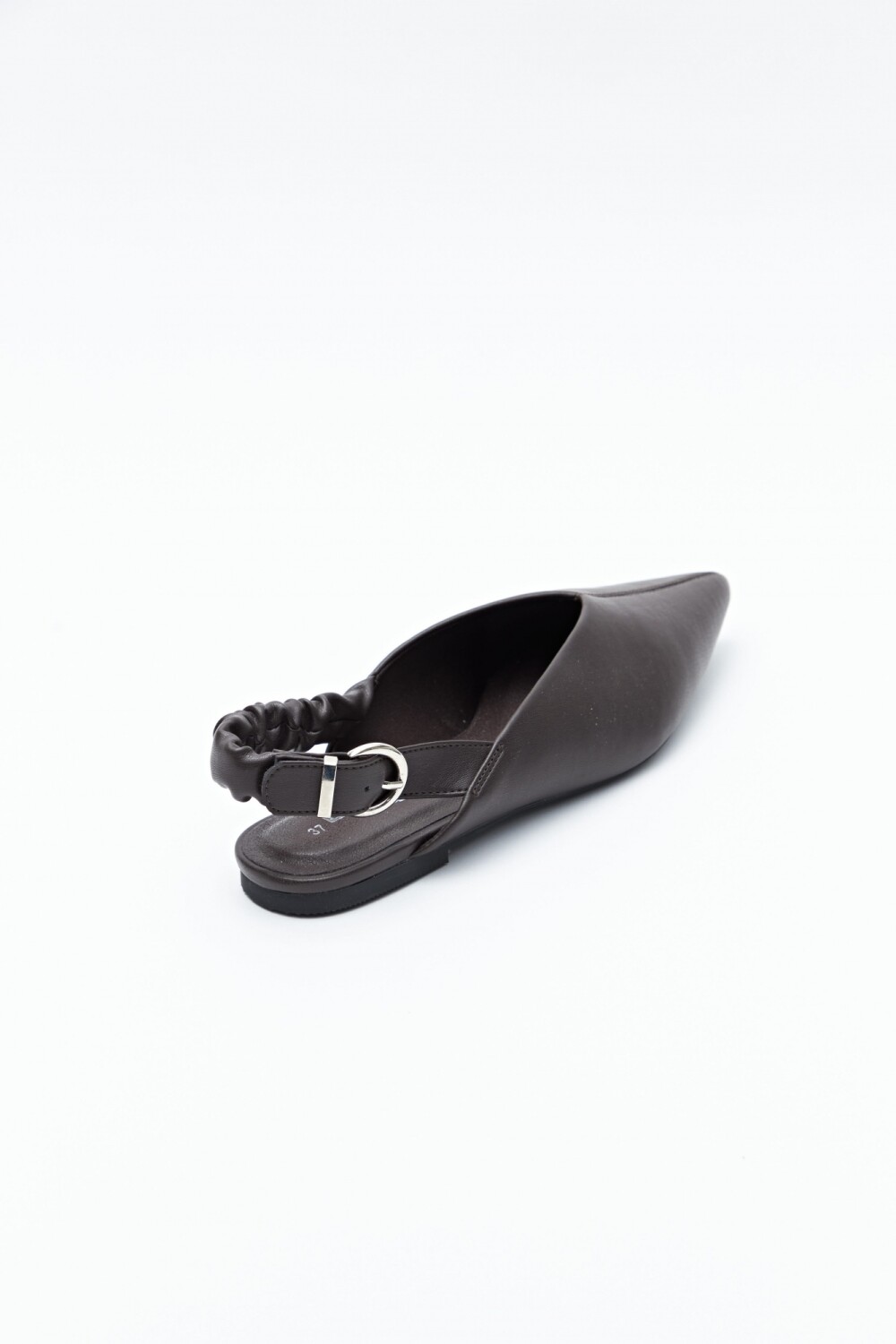 Zapato destalonado de punta afinada con diseño minimal, confeccionado en poliuretano de acabado liso. Presenta base baja y tira trasera con elástico y hebilla metálica que aporta ajuste y un detalle sutil. En sintonía con las tendencias de calzado 2026, las siluetas livianas, de líneas limpias y estética funcional se consolidan como un esencial moderno, ideal para elevar cualquier look con un gesto simple y actual.